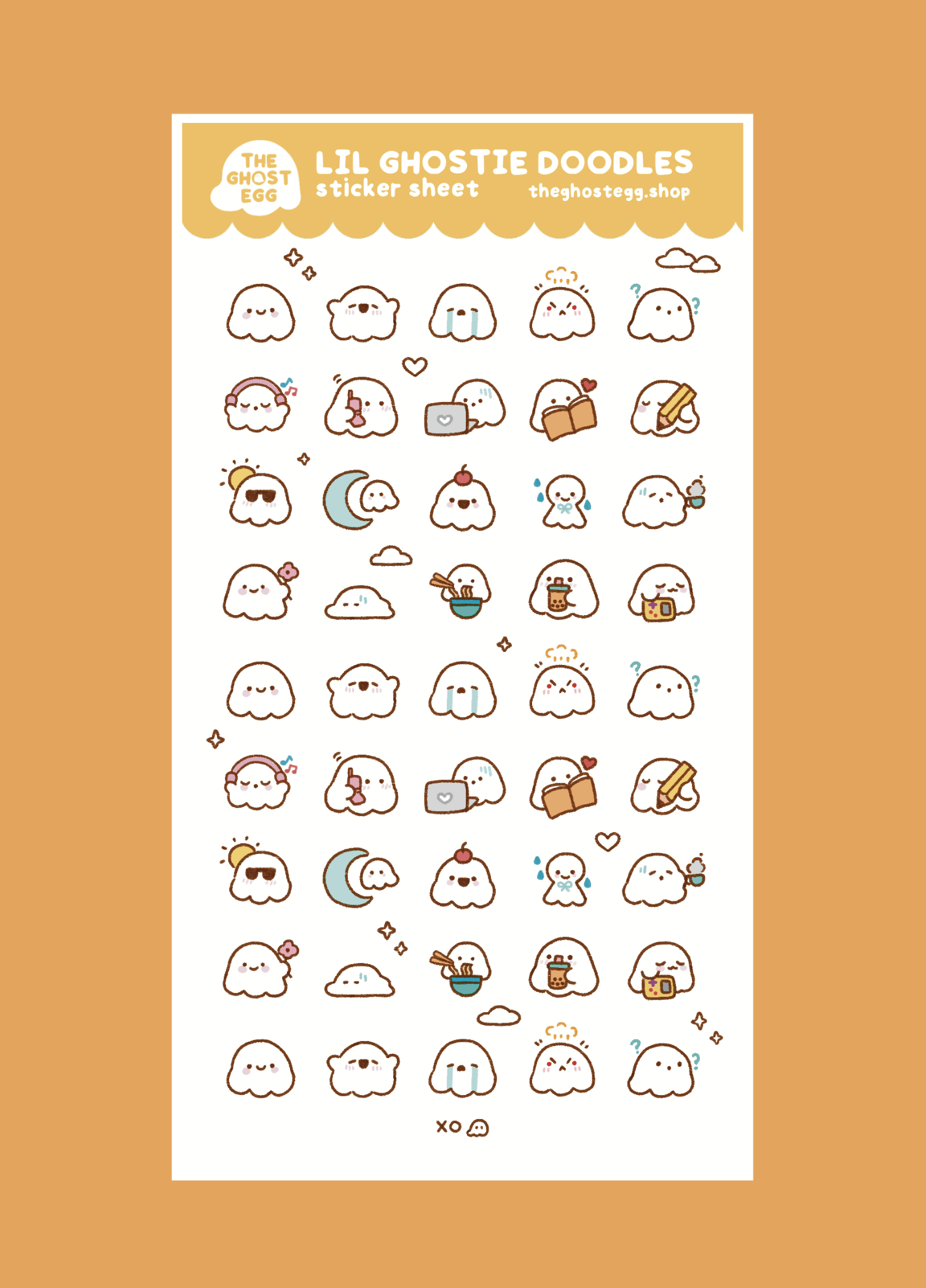 A set of cute ghost everyday doodle mini stickers with a vinyl finish and white borders. Perfect for your planner or journal, or decoration for pen-pal letters!