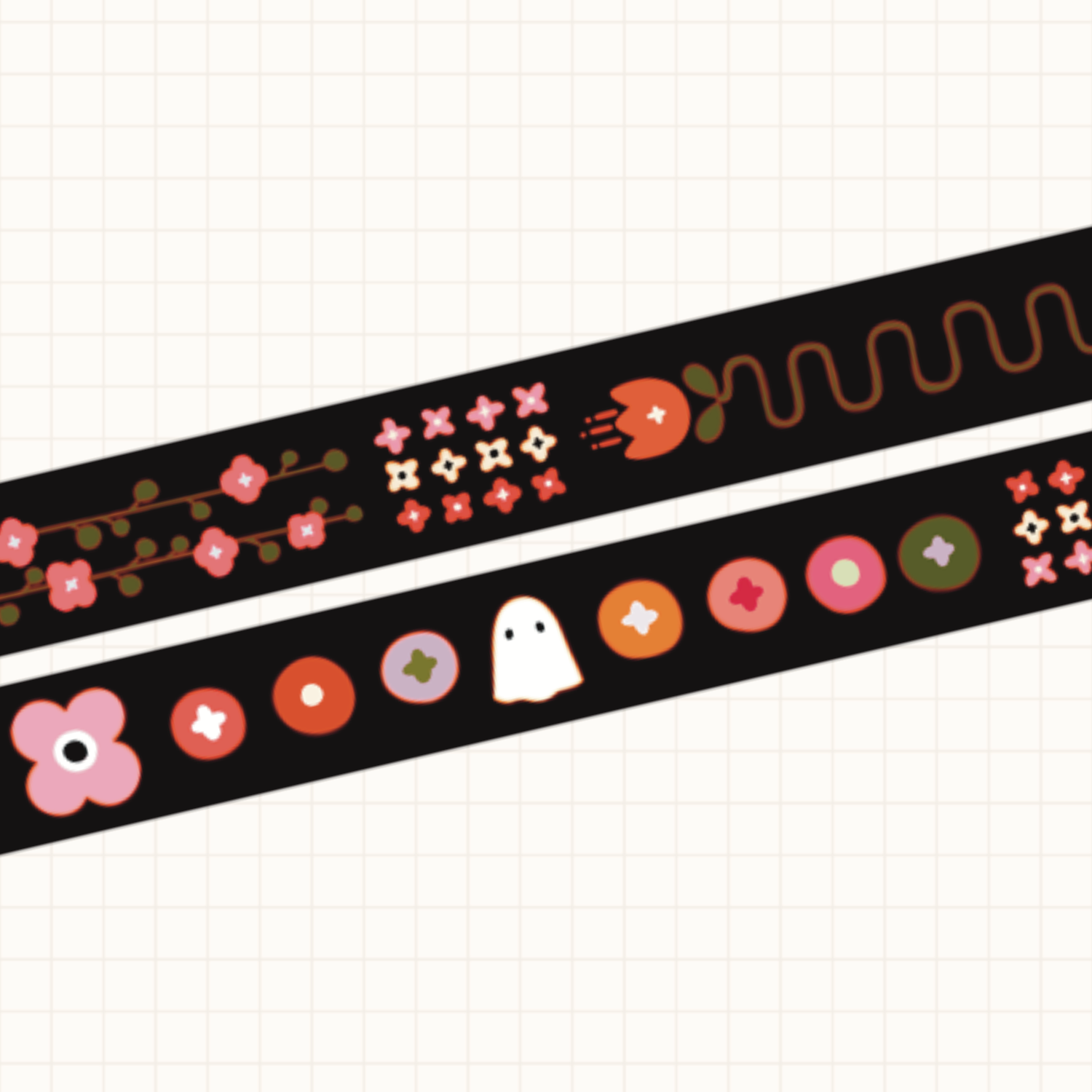 This design features a a repeating pattern of a ghost surrounded by retro style flowers. Perfect for journaling, wrapping gifts, or sealing envelopes!